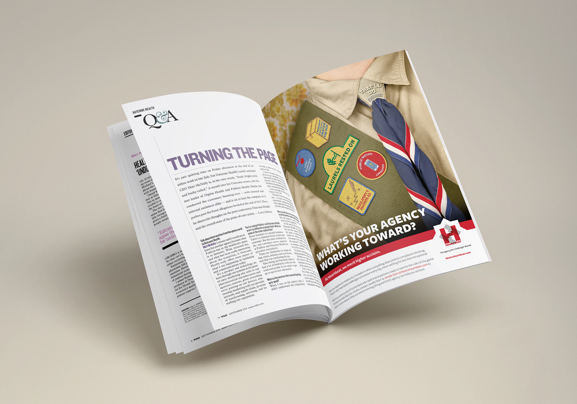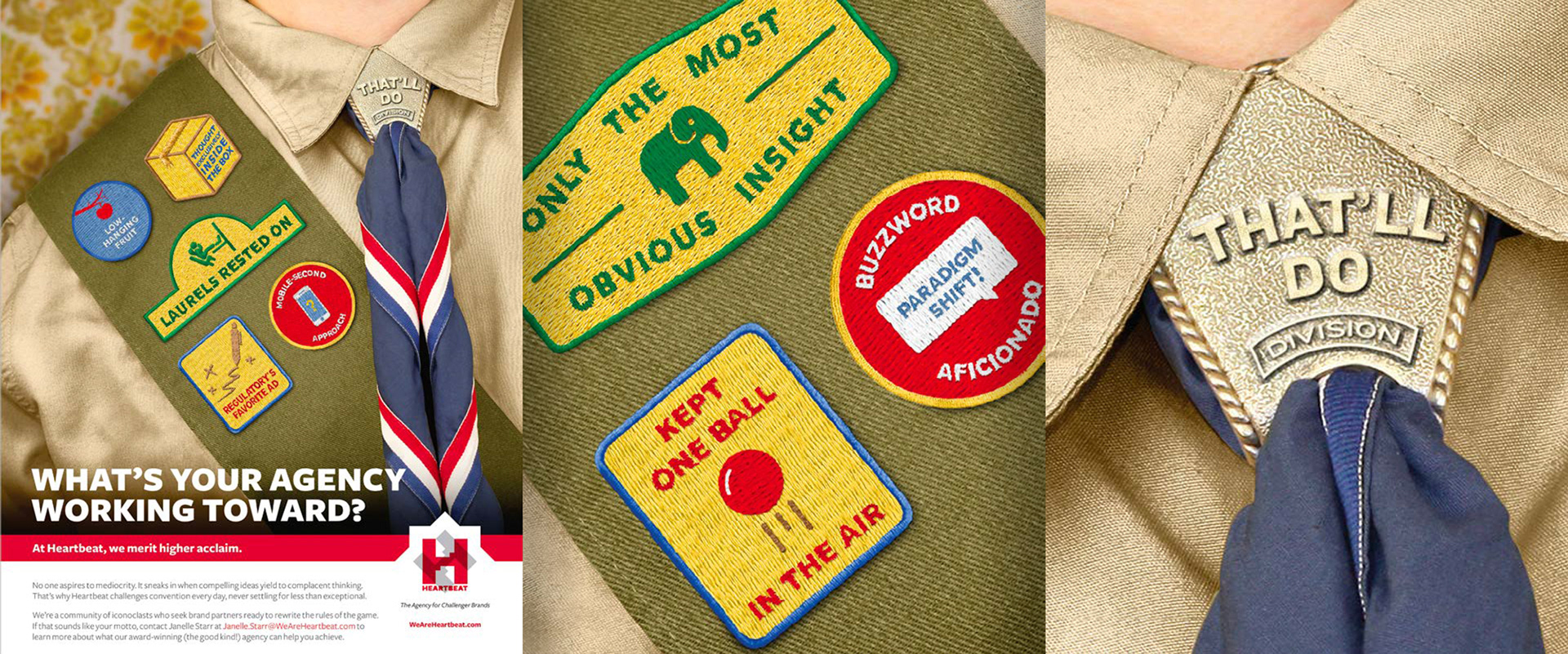 Concept and execution in Medical Marketing & Media (MM&M) Magazine for Heartbeat, a pharmaceutical advertising agency. The goal was to target potential clients, marketers with a strong sense of ambition and a desire to break the mold. My copy partner and I brainstormed several concepts, of which our "Crappy Participation Awards" concept was chosen. Using the ad's tone of sharp wit and humor, we created snarky scout badges, almost "anti-awards", asking the clients "What's your agency working toward? At Heartbeat, we merit higher acclaim." There have been three iterations of the ad, currently, with two badges swapping out each round, giving renewed interest.Nominated to the Top 5 Agency Self-Promotion 2019 MM&M Awards.