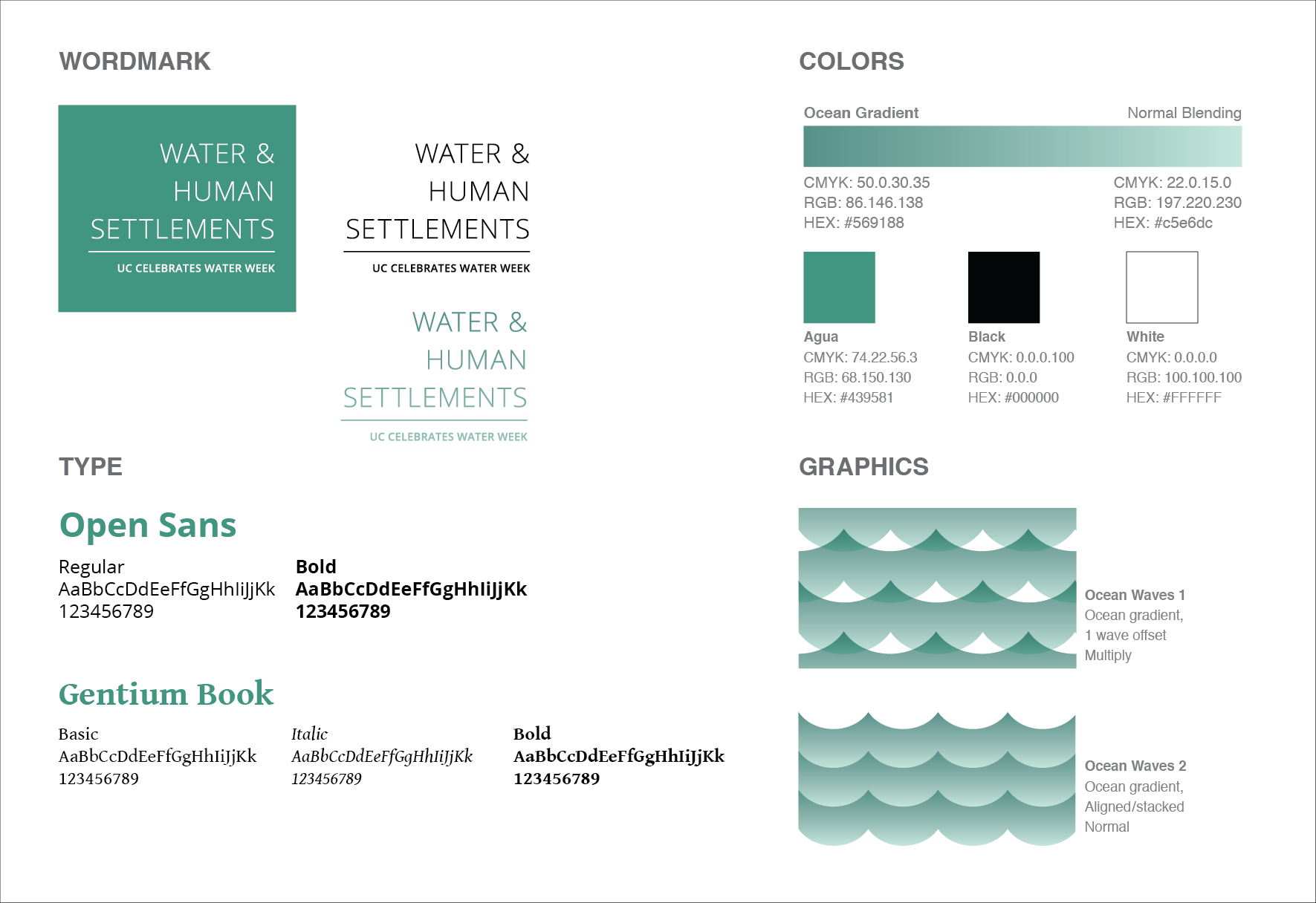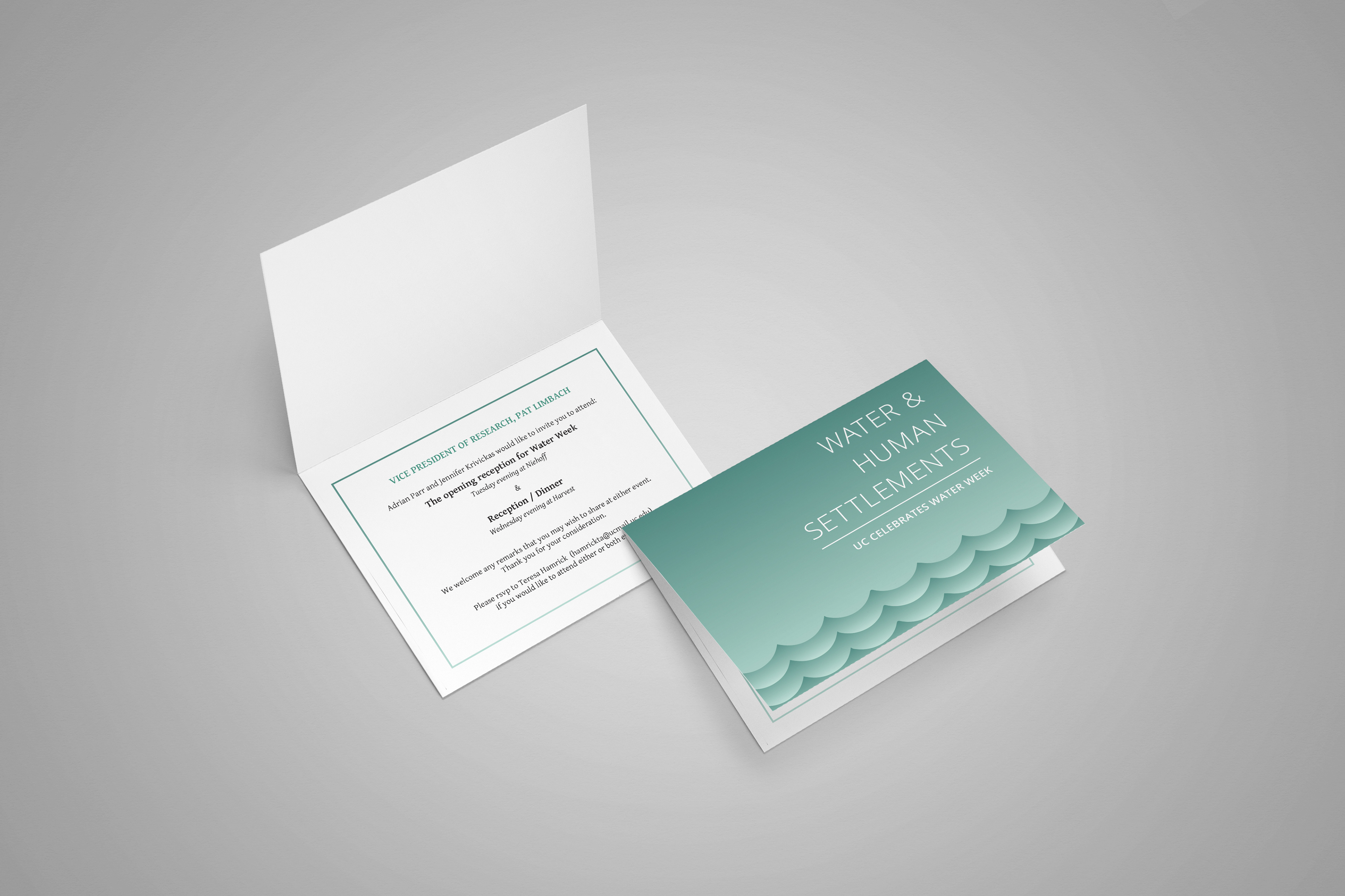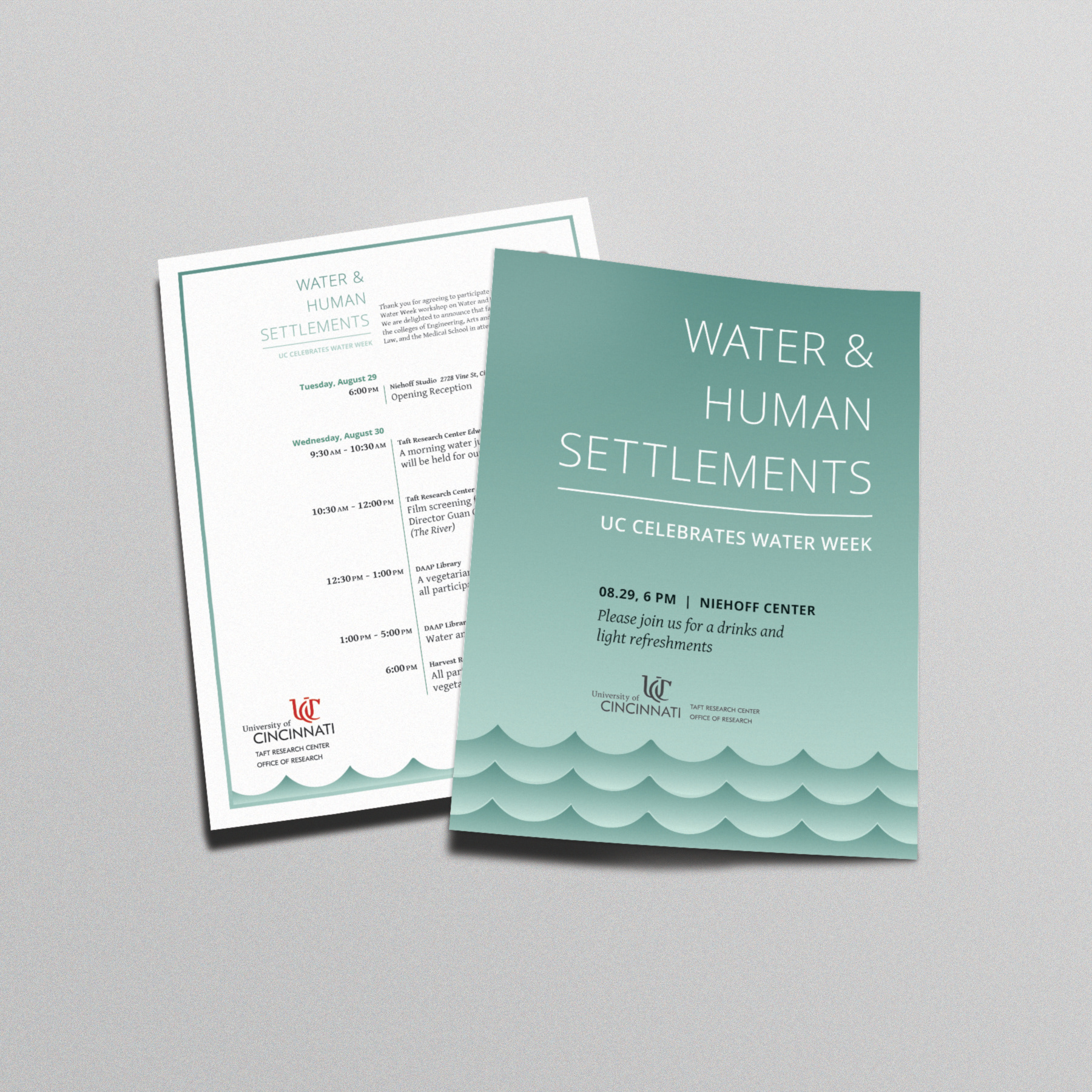 Working with the Research department VP I created support print materials for the workshop "Water and Human Settlements: UC Celebrates Water Week". Branding guidelines utilize the University of Cincinnati's brand typography, while creating a unique, fresh, and modern brand for the event. Materials shown include poster, formal invitations for keynote speakers, a schedule, and a save the date.